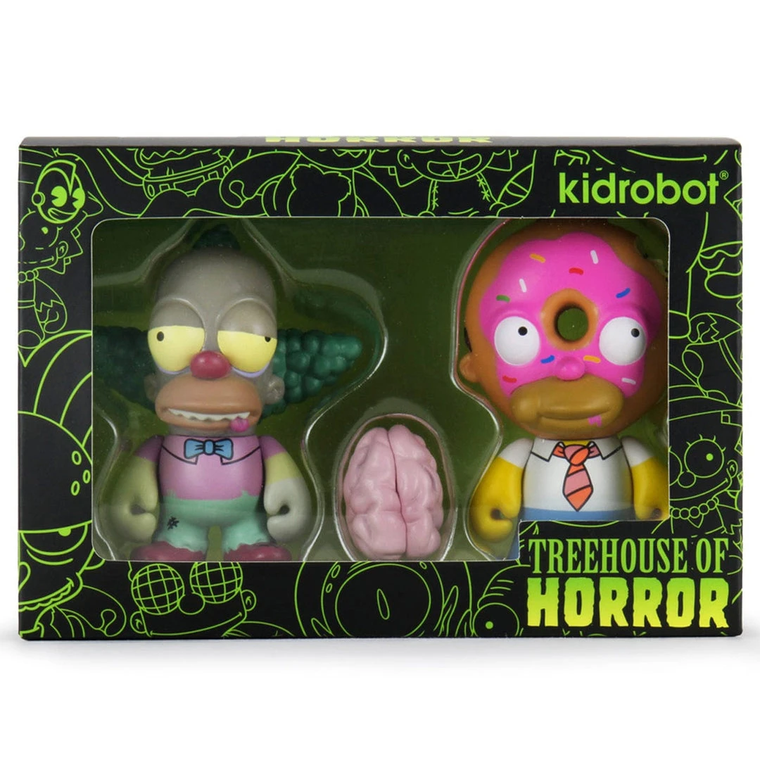 Presenting The Simpsons Treehouse of Horror 2-Pack Mini Figure Set with new versions of your favorite characters from Kidrobot’s Blind Box Mini Figure Series based on the classic Halloween episodes. This 2-pack set features Frosted Pink Sprinkle Donut Homer and glow-in-the-dark Krusty the Clown Zombie 3″ Vinyl Figures with brain accessory. This special collectible 2-Pack Mini Figure Set can only be found at Kidrobot.com and IamRetro.com, while supplies last.