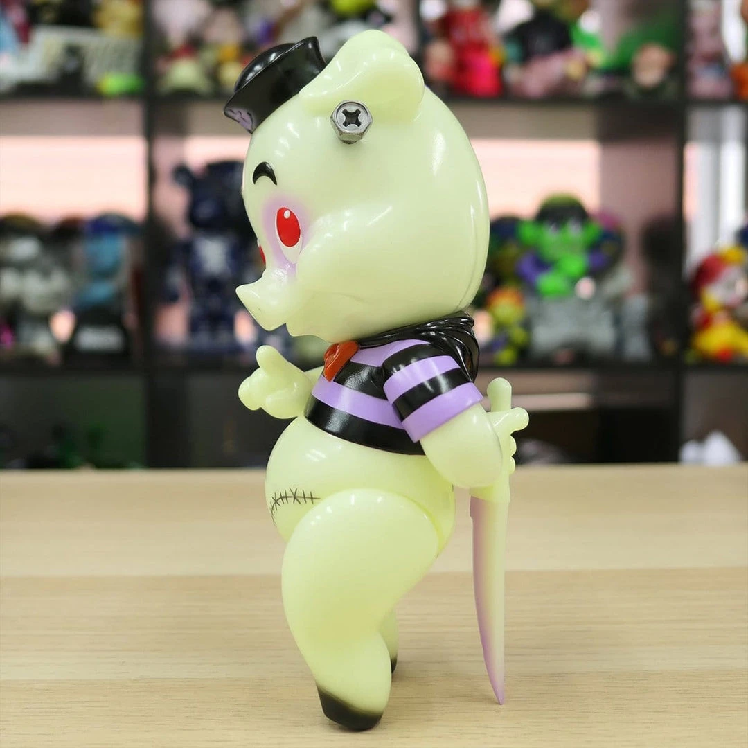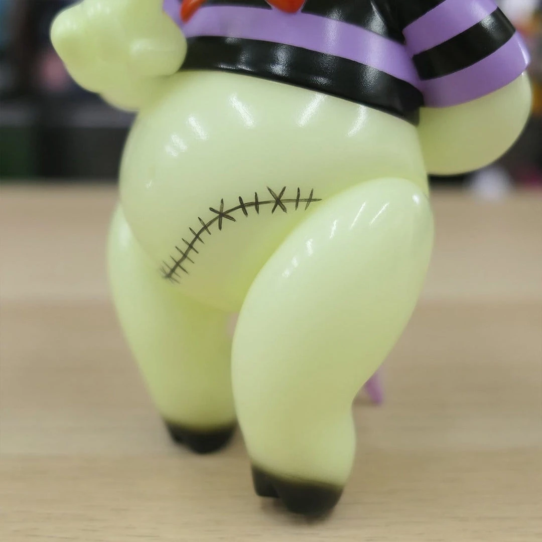 Frank Kozik’s Piggums got the “Frankenstein” treatment! Not only did Franken Piggums get real screws installed into his temple, but also got the GID skin!! Plus his stitches are hand painted by BBT one by one. The stitches on the body and face are all unique as they have been hand painted in Japan. You don’t know which one you would be getting until you receive it but it’s top notch quality.
