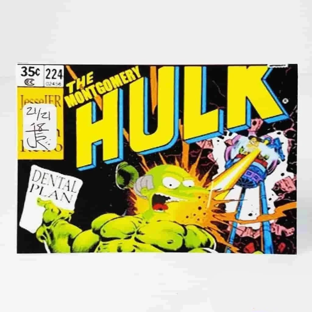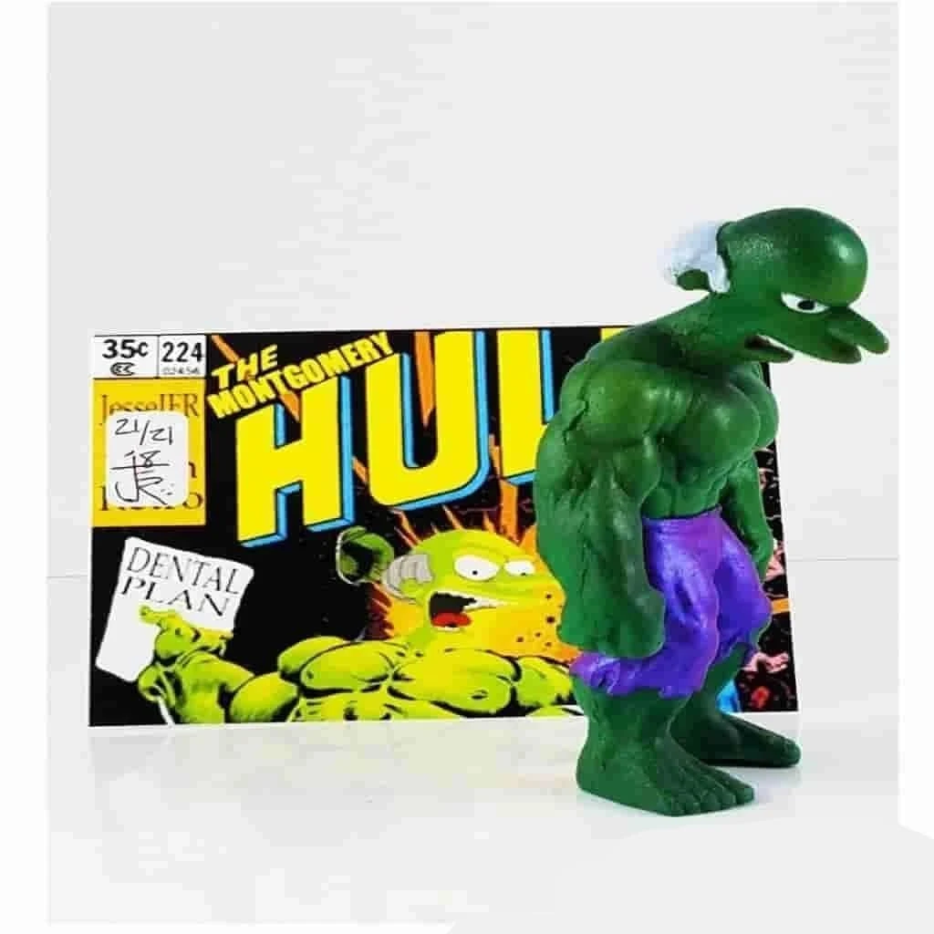 The resin Montgomery Hulk stands at 3.5 inches and is hand casted and hand painted by @JesseJFR in collaboration with us here at IamRetro. This Original First Edition includes dental plan accessory, pearlescent shorts, matching pearlescent sticker on the card topper and each unit is numbered XX/21.
