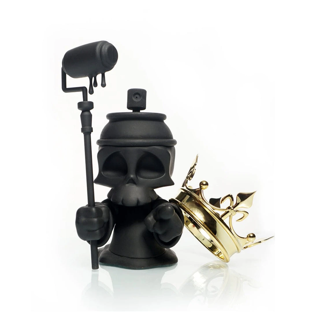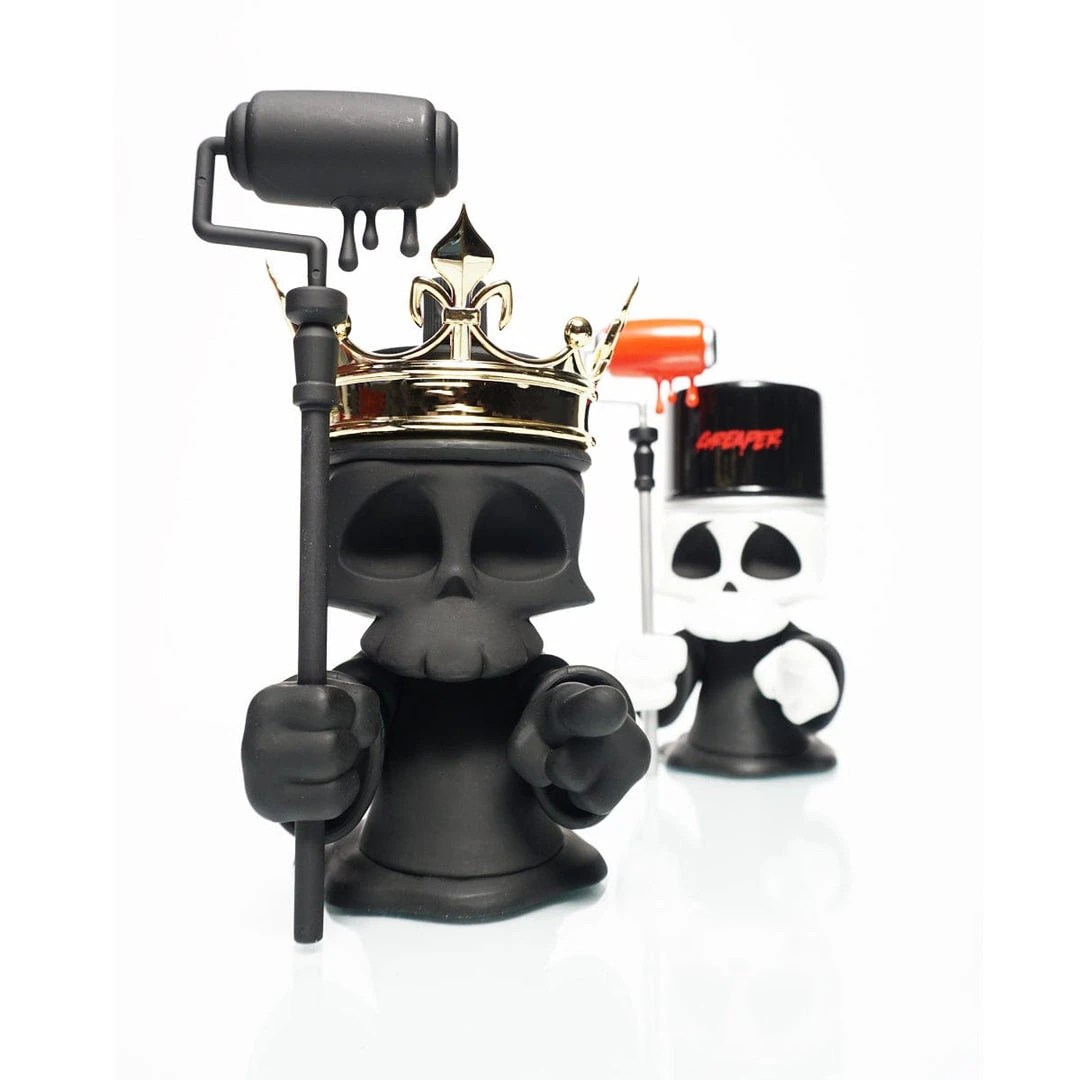 Greaper, is the reaper and collector of spent spray can souls and now it has come time to collect on a freshly designed mural debt. Black Death Greaper comes murdered out in all at black on entire body and paint roller sta accompanied with a shining gold crown only good enough for a Graffiti King.