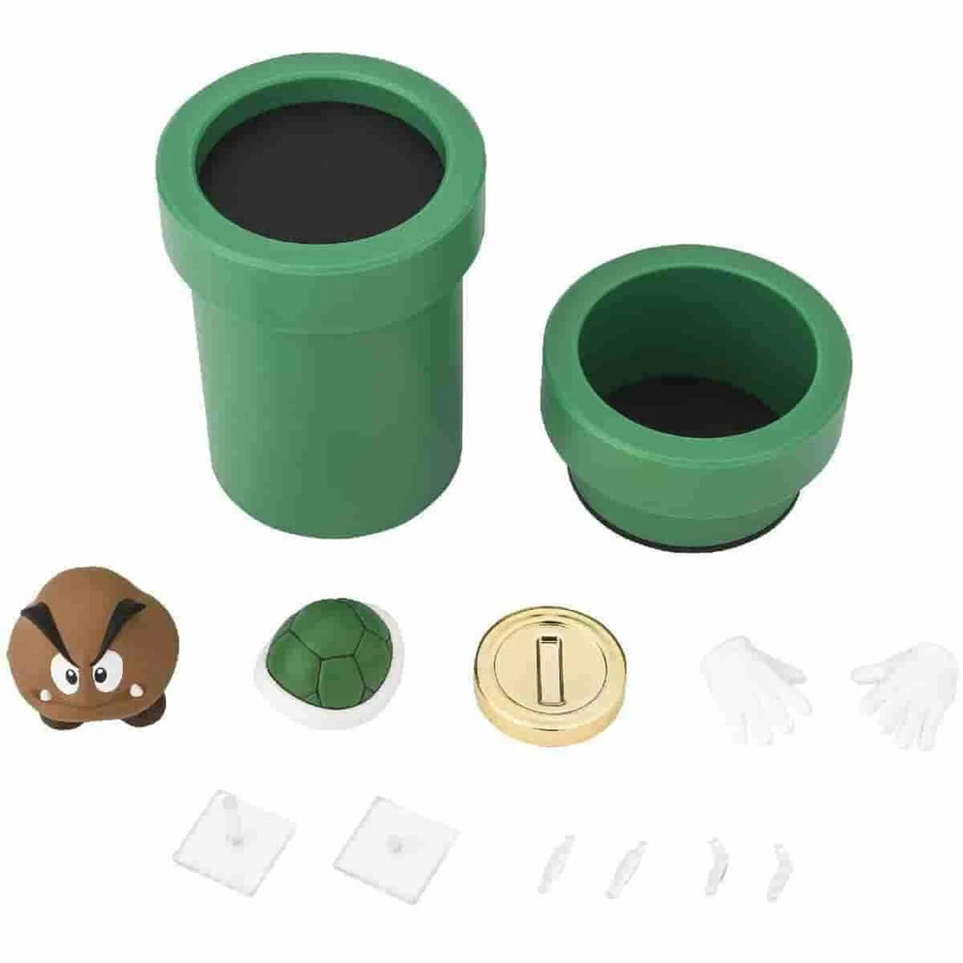 This play set features 2 pipes with adjustment parts, Goomba, coin, 2 coin stands, green shell with interchangeable hands for holding the green shell, and green shell connecting parts.