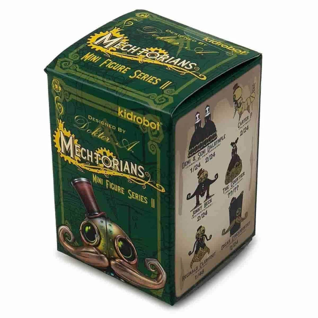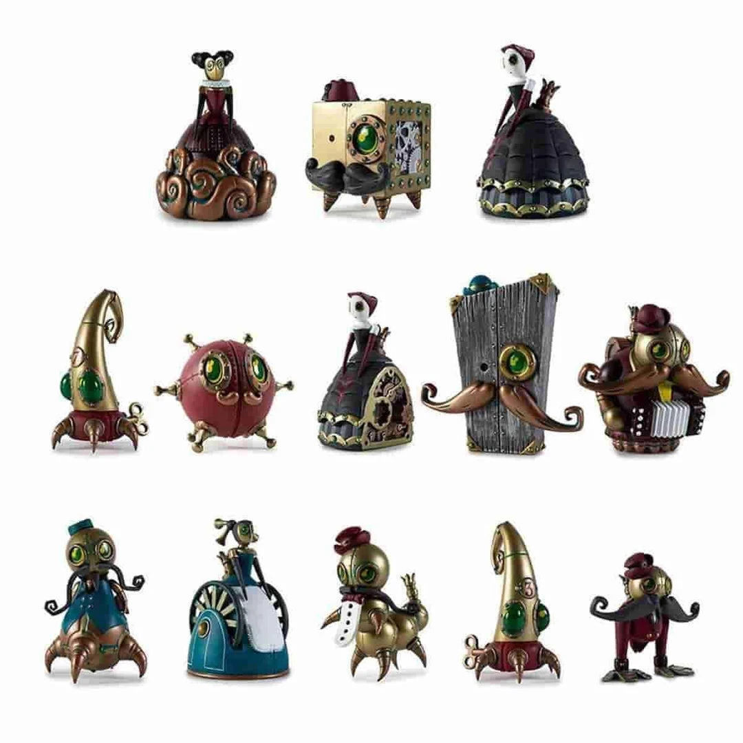 Welcome to Mechtoria! Kidrobot pulls back the curtain to the long forgotten characters of the world of Mechtoria. Follow us down the darkened cobbled streets and meet the artistic cast of Doktor A’s almost unimaginable world! Gamblers, musicians, entertainers and more make up the cast of The Mechtorians in this all new collectible Kidrobot Mini Art Figure Series by Doktor A.